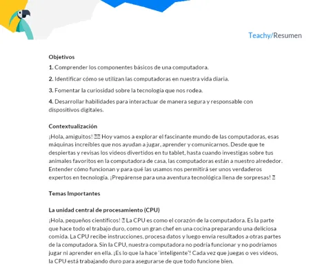 Plano de aula sobre Introducción a la Computación para 1er Grado